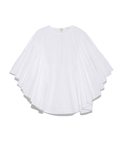 豊かなドレープを描くラッフルスリーブが、スタイルのポイントになったプルオーバーブラウス。甘めのシルエットながら、襟ぐりの詰まったすっきりとした身頃でクリーンな印象に。ボトムを選ばない丈感で、カジュアルからキレイめまで幅広く着まわせるアイテムです。