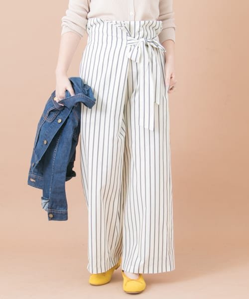細めのダブルストライプが上品な印象のデザイン。ウエストのリボンやタックの位置にこだわり、スタイルアップして見えるシルエットに仕上げました。コットン100%の生地を使用しているので、さらっと軽い着心地なのも嬉しいポイント。
