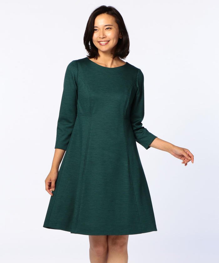 裾にかけてフレアに広がるスカートで、フェミニンな雰囲気満点のワンピース。ストレッチが効いているポンチ生地を使用しているので、着心地抜群です。ウエスト高めの位置に切り返しがあり、またダーツが入っているため立体感あるシルエットでバランス良く着こなせます。