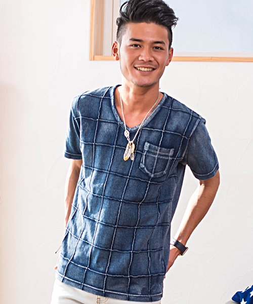 CavariA【キャバリア】インディゴ染め天竺タックVネック半袖Tシャツ