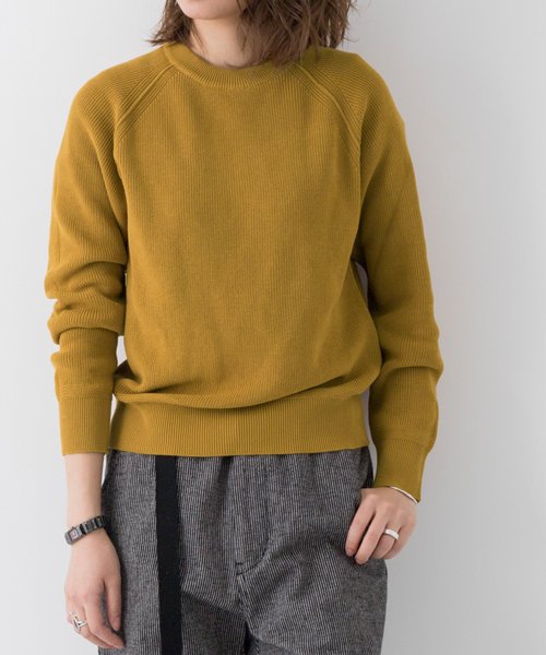 シンプルながらも細かな畦の編み地が表情を作ってくれるクルーネックニットは、ラグランデザインもカジュアルな印象の一着。