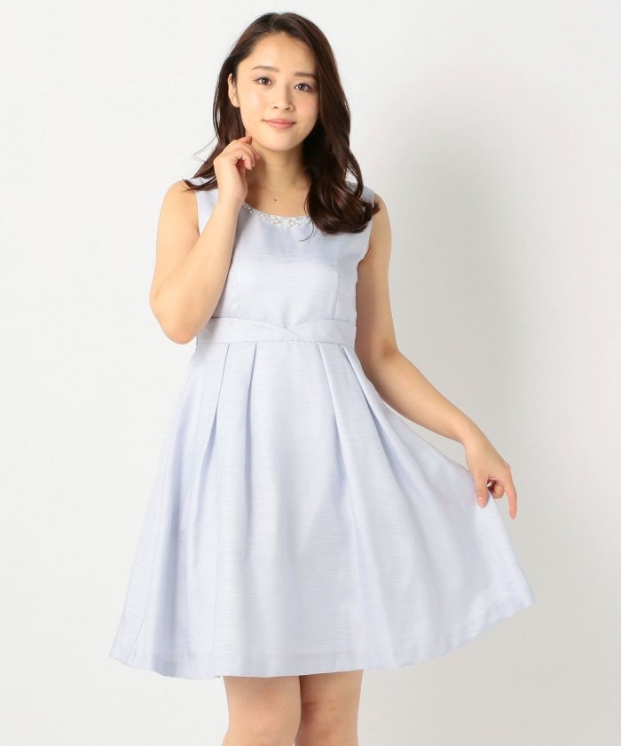 首周りにはビジューのデザインでエレガント。レースを施したデザインが可愛いバックスタイルで、存在感のある一枚です。ウエスト高めの位置に切り返しがあり、バランスよく着こなせます。