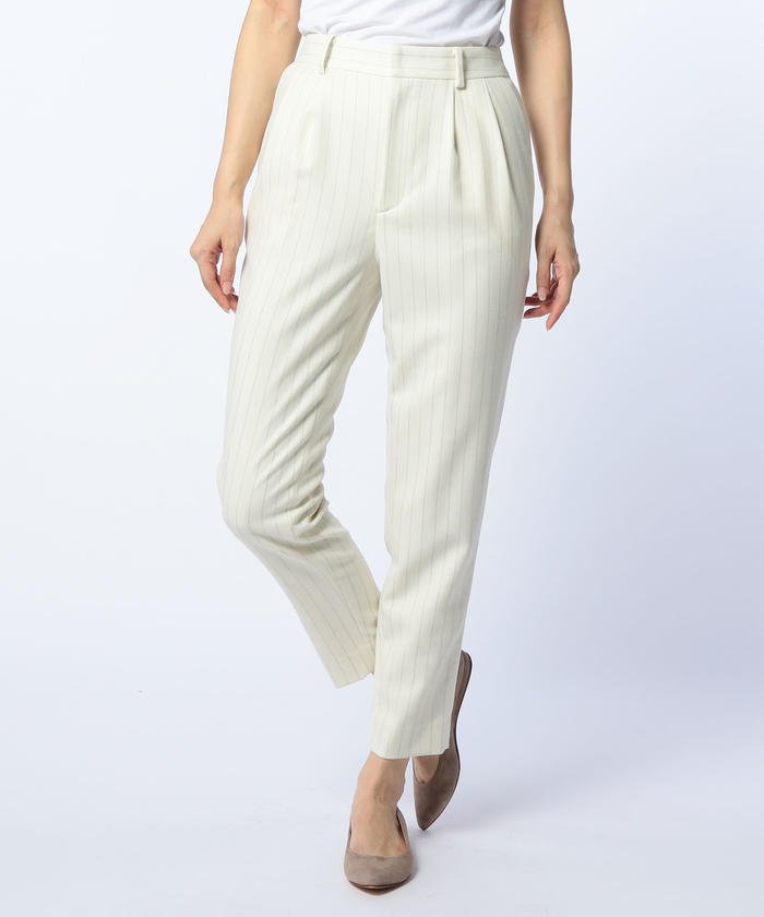 シャープな印象をもたらすストライプのパンツ。細いラインやシックな色使いが大人らしさのポイントです。着丈は半端で足首が覗き、抜け感を効かせます。玉縁ポケットなどキレイ目のディテールを取り入れており、お出かけやお呼ばれ、ビジネスシーンなどにもぴったりです。