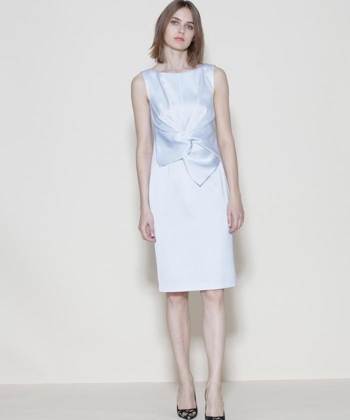 控えめな光沢のトリアセサテン素材を使用した高級感と上品な風合いが魅力のワンピース。大胆に配置したクロスリボンディテールが華やかな存在感を放ちます。大人の女性にも着やすい膝丈や体系をさりげなくカバーする美しい構築的なドレープディテールにも拘りました。モードな雰囲気を奏でるブラックと春らしいサックスとピンクを加えた色展開も注目です。