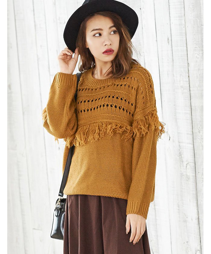 ボリューミーなフリンジが、存在感をアピールするニットトップス。