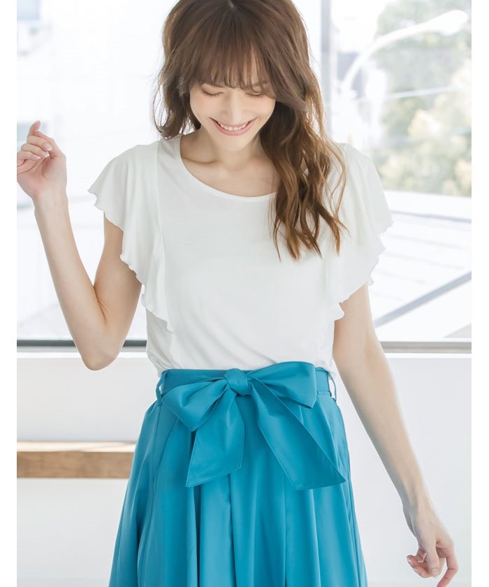 着心地の良いとろっとした生地がくせになる!ショルダーフリルTシャツ。