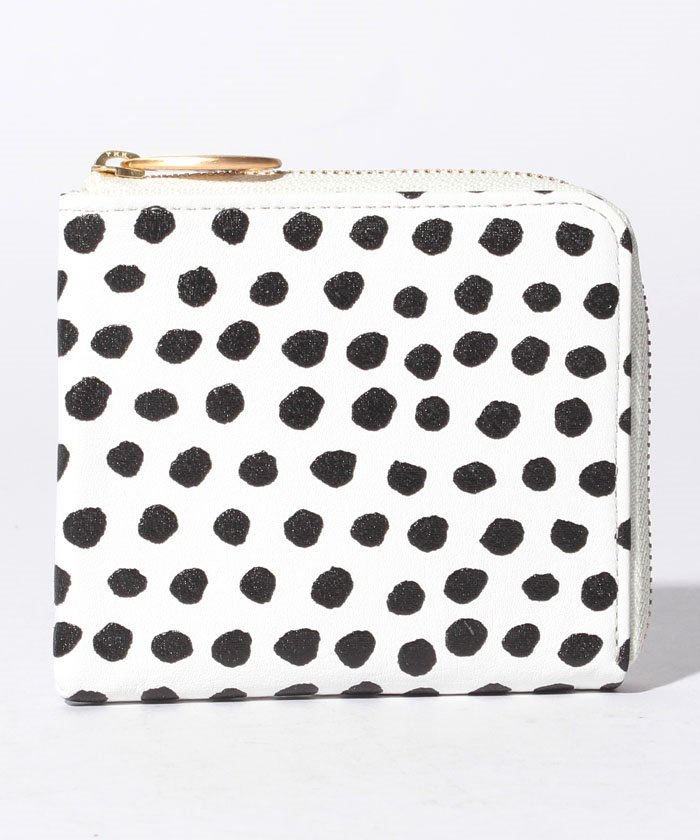 手書き風のドット柄が可愛いシリーズです。コンパクトなL字型の折財布でカードが8枚、ファスナーの無い小銭入れと札を折りたたんで収納できます。カラーはブラック、ホワイト、ピンク、ブラックスエード(ブラック系)の4色展開です。ブラックスエードはWEB限定色です。