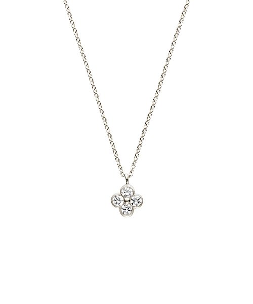 キュートなフラワーモチーフのネックレス。つややかなフレームの中にある4粒のキュービックジルコニアが大人っぽく演出してくれそう。