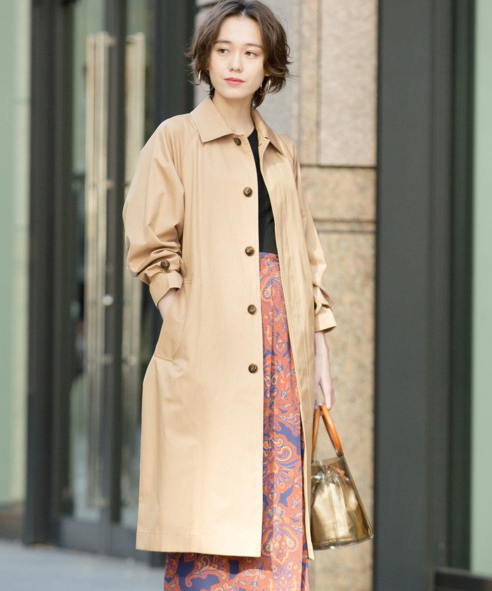 春コートの代表アイテムの1つでもあるステンカラーコート。たっぷりとしたシルエットのコートを女性が着ることで、華奢さが引き立ちより女性の格好よさを引き立てるクールなコートです。ベルトで絞ったウエストコンシャスなシルエットで、アウターながらあえてワンピースのような着こなしも楽しめます。