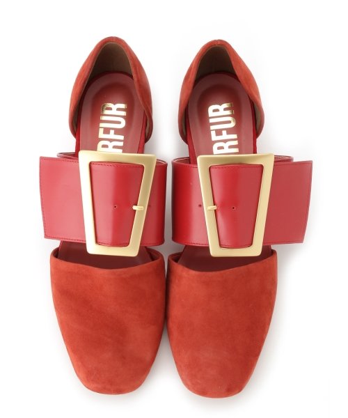 人気の復刻アイテムは、素材使いと色合いに変化をもたせた新バージョン。インパクトのあるビックベルトデザインで、モダンに仕上げたシューズです。つや消しのゴールドカラーのバックルが、品のある艶やかさを演出。高すぎない太ヒールで、歩きやすさも抜群です。