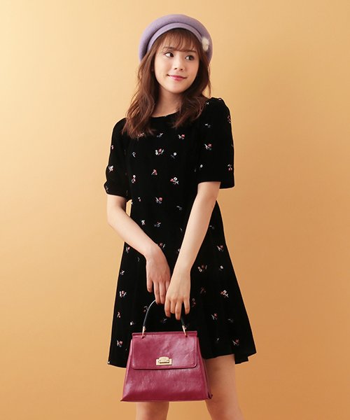 ベルベット素材に小花の総刺繍を全体にあしらったワンピース。