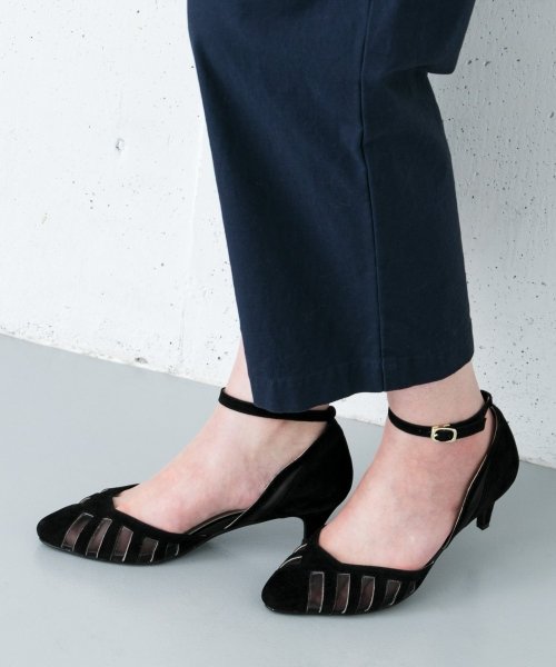 カットワークとチュールの組み合わせがレディライクなパンプス。アッパー部分はもちろん、かかとにもチュールをあしらいディティールにこだわった1足に。普段使いにはもちろん、ドレス合わせなどで華やかなシーンにも対応可能。 一足あると使い回しのきくパンプスです。