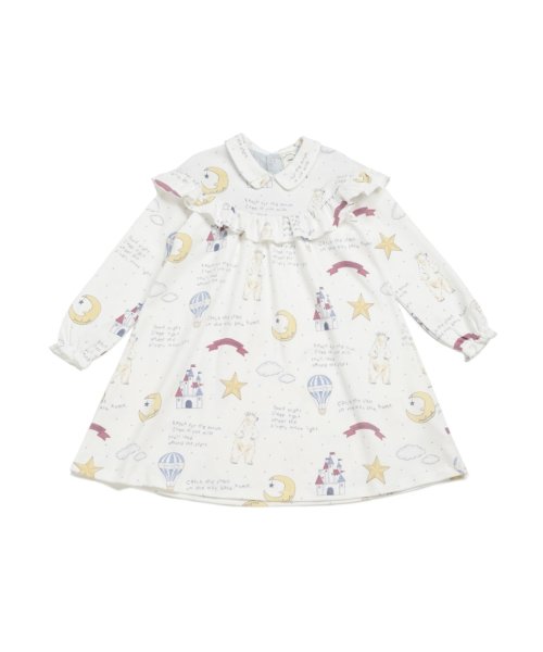 胸元のフリルが特別感を演出してくれるワンピース。背中の開きはスナップ釦で開け閉めできるので着脱しやすいのがポイントです。寒い冬にうれしい、起毛したやわらかなスムース素材のカットソー生地を使っているので、暖かくて優しい着心地も魅力。また、華やかな星やお城、クマ、気球など、絵本からインスパイアされたファンタジー柄と、’たくさん寝よう’、’星をつかまえよう’などファンタジーな英文が入っています。寝ている間もきっとHAPPYな時間を過ごせるはず。