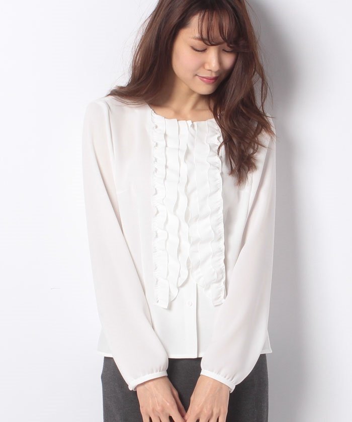 フロントにトッピングしたフリルが、大人の可愛さをさりげなく高めるアクセントになったノーカラーブラウス。気品溢れるエレガントな仕上がりだから、合わせるボトムス次第でオケージョンにも対応してくれるはず。